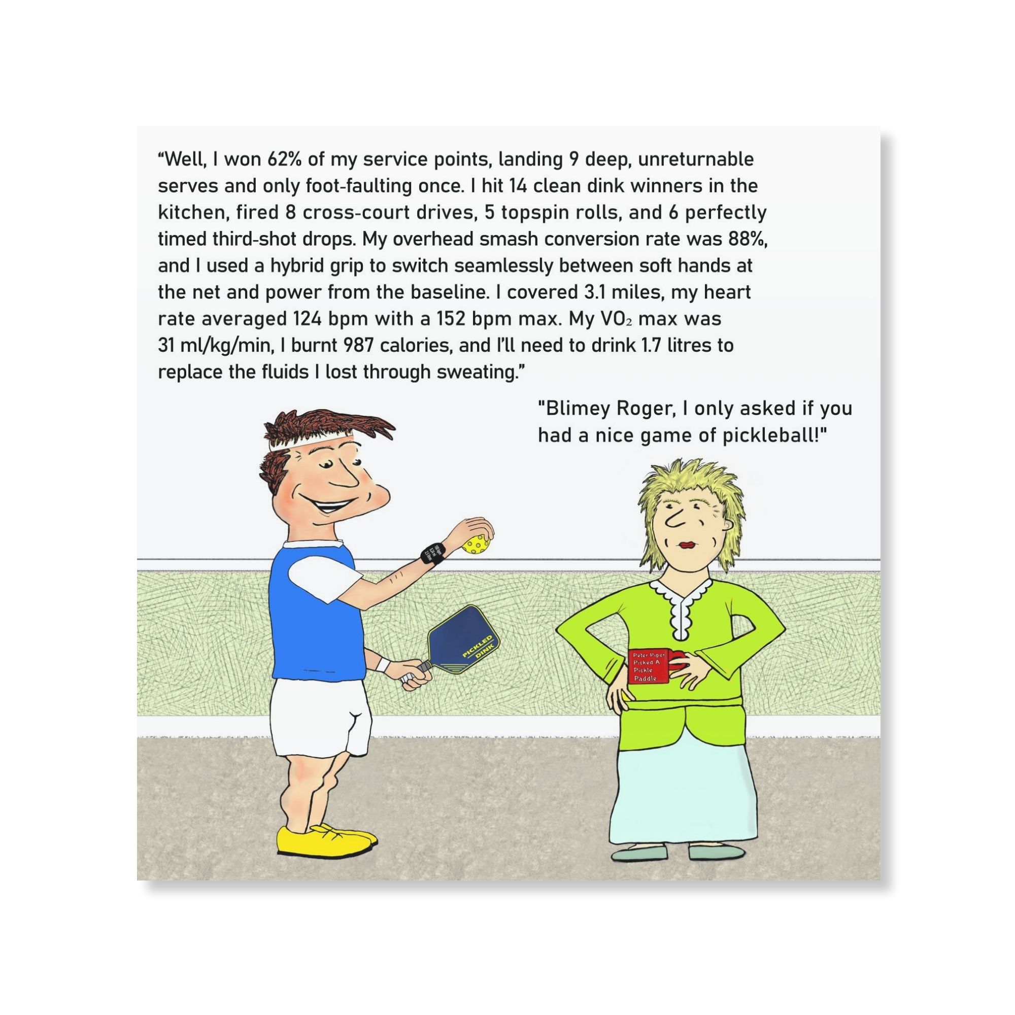 This personalisable funny pickleball card is ideal for any player who is obsessed with tracking and measuring all of their match statistics. Unfortunately though, they then have to share those thrilling stats in a post-match debrief with whoever is available to listen!